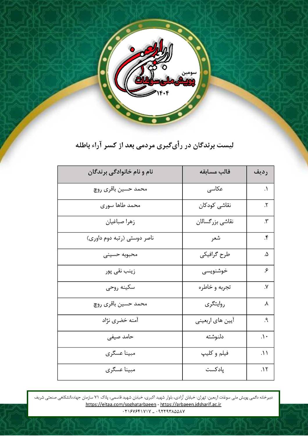 به اطلاع شرکت کنندگان محترم می رساند نتایج رأی گیری مردمی (بر اساس دستورالعمل اعلام شده از طریق کانال و سایت رسمی پویش) پس از حذف آرائه باطله استخراج شده است.اهداء جوایز پس از برگزاری اختتامیه و هماهنگی با برندگان تقدیم می گردد