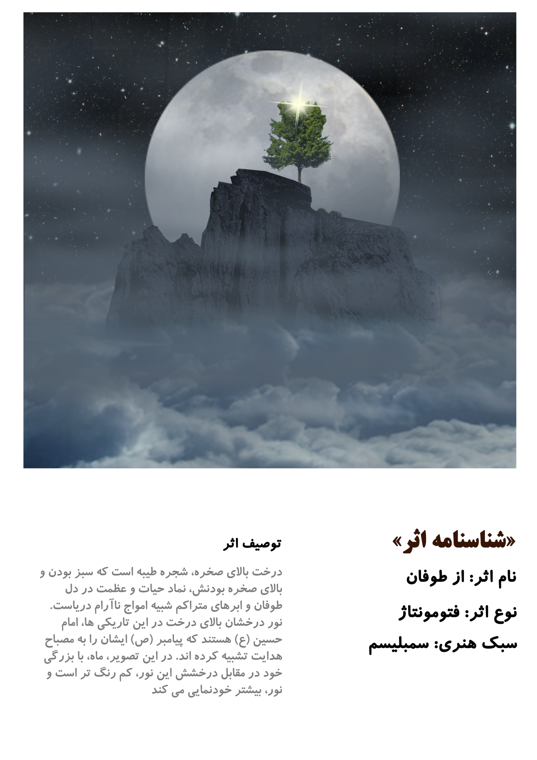 نام اثر: از طوفان شجره طیبه و نور حسینی (ع) در دل طوفان ها چون کشتی ای از جنس صخره ای سخت مقاوم هستند و عظمت نور ماه مقابل امام حسین (ع) به تاریکی سنگ ماند.