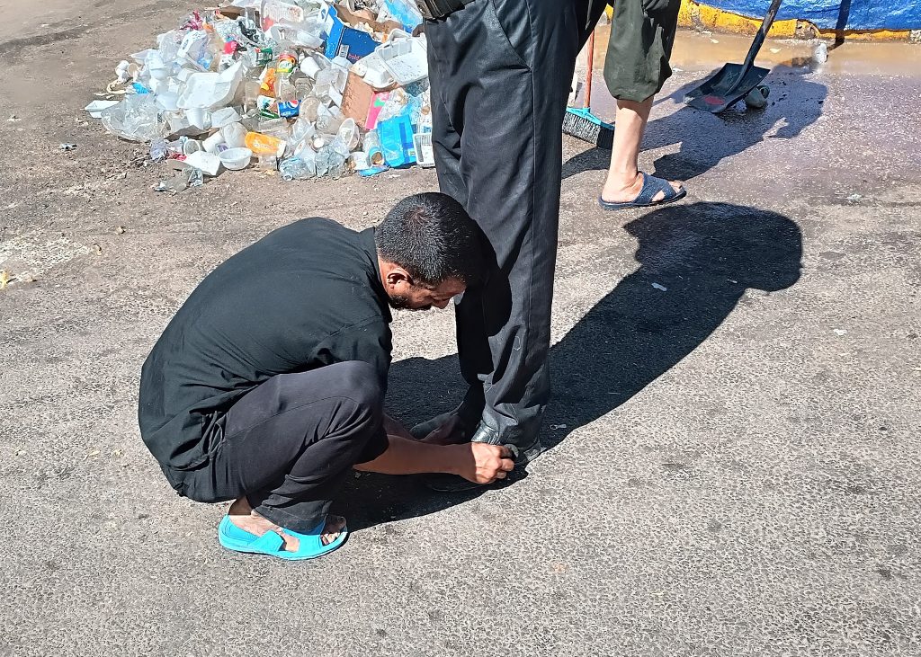 رساله ها و کتاب ها درباره مرد خادم می توان نوشت. در این عکس، خادمی که دمپایی پاره به پا دارد، کفش یکی از زائران را واکس می زند! آنچه مرا مجذوب این صحنه کرد، نقد کاپیتالیسم و ده ها مکتب فلسفی – جامعه شناختی غربی در یک نگاه بود. خادم موکب خم شده است و با اینکه خود دمپایی – و نه کفش- پاره دارد، کفش زائر امام حسین (ع) را واکس می زند تا تمیز و براق شود. این است اهمیت دوستدار حسین؛ هم برای خادم و هم برای زائر! گویی اینجا من و او وجود ندارد؛ اینجا همه یا ما هستند یا هیچ! این تصویر با نقد مصرف گرایی، ماتریالیسم و لیبرالیسم فردگرایانه، تقابل آشکار بین جهان بینی مدرن و معنوی را نشان می دهد و تداعی گر این نکته است که عشق به حقیقت، فراتر از مرزهای مادی و دنیوی است.