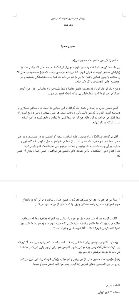 من، به عنوان نوجوان حسرت به دلیل که تا کنون زیارت اباعبدالله و زیارت اربعین نصیبش نشده، این دلنوشته را نوشتم. باشد که سیدالشهدا بپذیرند