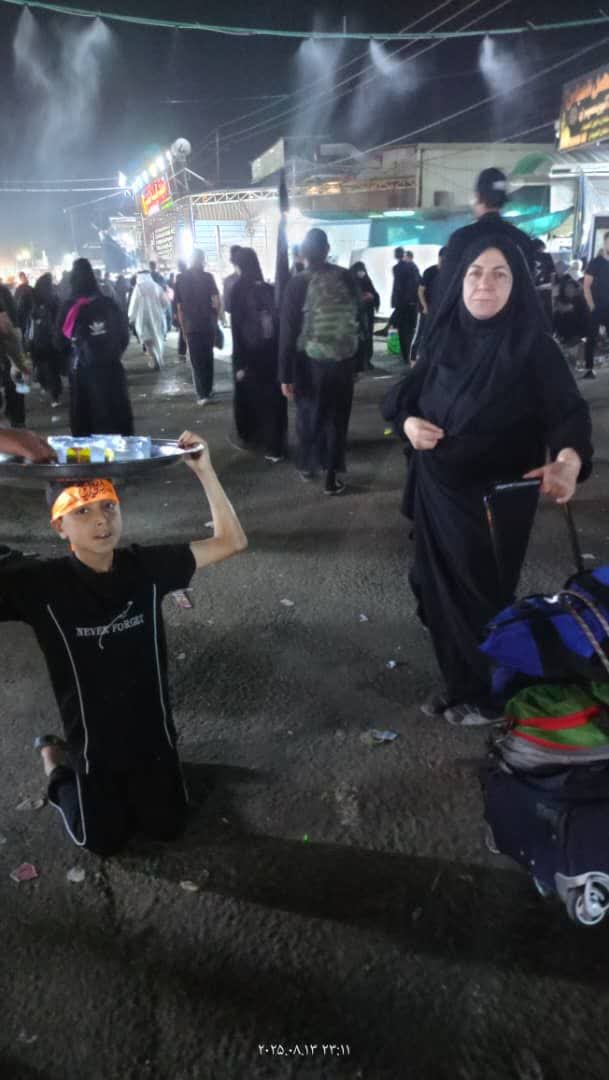 احترام نوجوان پسر عراقی در پذیرایی از زائران اربعین و نوشته روی پیراهن که حسین هرگز فراموش نخواهد شد درمسیر نجف به کربلا و با توجه به گرمی هوا ایجاد آبپاش در بالای سر زائران